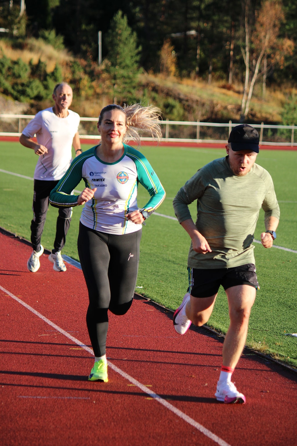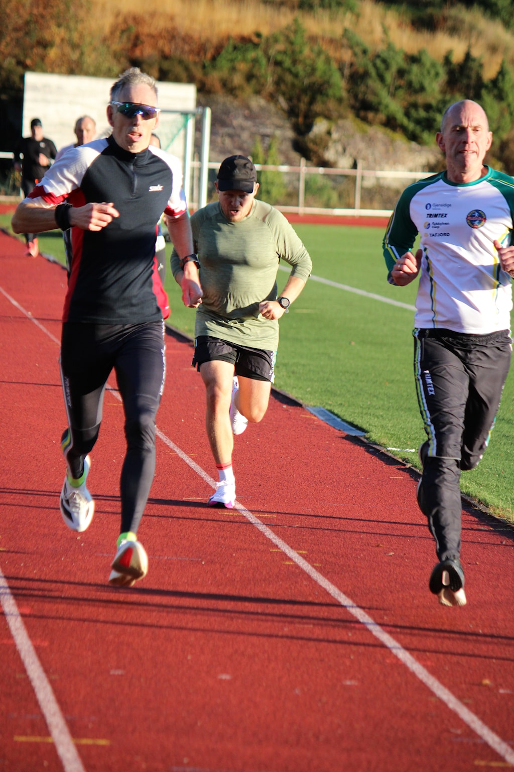 Skodda sleppte taket før, og under, oppvarminga. Den tok til ganske nøyaktig 10.00. Friidrettsleiar Alf Petter Bøe, M 55-59, styrte treninga og klokka. Felles-programmet for dagen var 12 X 400 meter. Bjørn Arve Brune, spreking på høgt nasjonalt nivå i klasse M 60-64, hadde teke turen frå Stranda. Frode Mauren, i klasse M 50-54, hadde til å med teke ferje for å kome seg til treninga! Fridtjof Fredriksen var der, mannen som etter nyttår kan få ein ny vår i klasse M 60-64. Trond Bonesmo, som driv og set nye personlege rekordar som 55-åring, gjennomførte ei god økt.