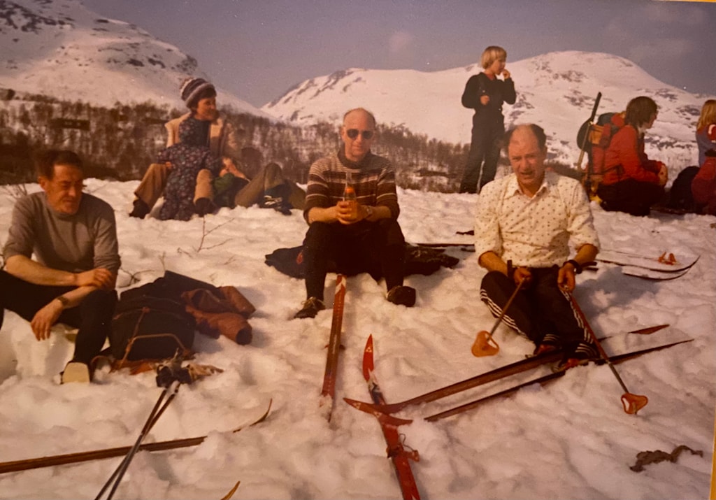 Vidare ser vi at Kaspar har utstyret på. Ski av merket Fischer, som han sverga ti, både i gode og vonde dagar. Leiv har sparka av seg sine (av same merke), og ser ut til å leske seg med ei solo – eller kanskje Asina – som var like vanleg den tida.