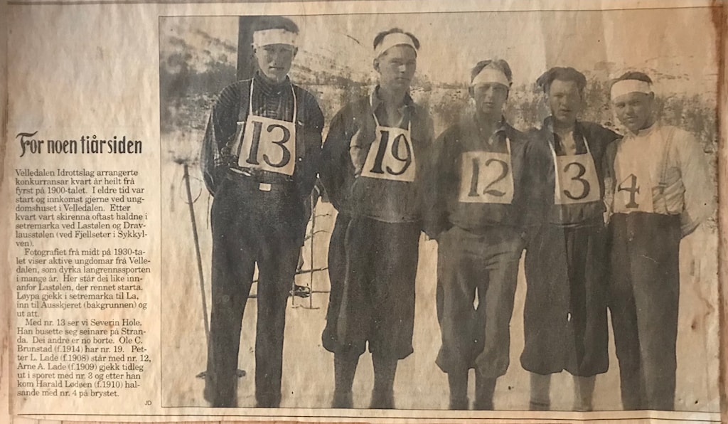 Eit interessant foto. Fire av fem stiller i panneband. Severin og Harald på flankane stiller neppe i fullt «kampantrekk» då vi ser at Severin har belte på seg, Harald har bukseselar. Ole C, Petter og Arne Lade stiller alle i nikkers. Startnummera er kanskje det mest imponerande, med særs tydelege tal