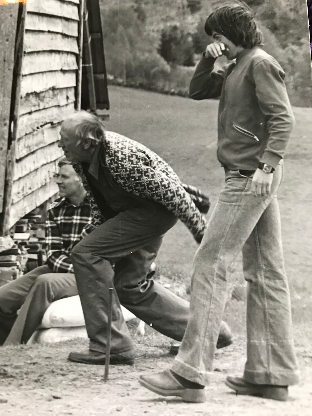 På fotoet er eg saman med to gode grannar, Ole L. Hole og Oddmund Skylstad. Begge fødde i 1923 og begge inspirasjonskjelder til at hesteskokasting vart idrett i Velledalen heilt på slutten av 1970-talet. Legg merke til knebøyen! Fotoet er frå Knut-tunet på Hole, fast samlingstad alle sundagar vår-, sommar-, og haust med lagleg vêr/temperatur.